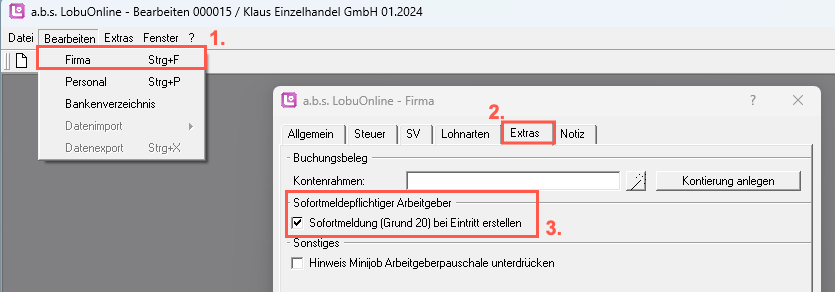 3. Aktivieren Sie die Option "Sofortmeldungen (Grund 20) bei Eintritt erstellen".