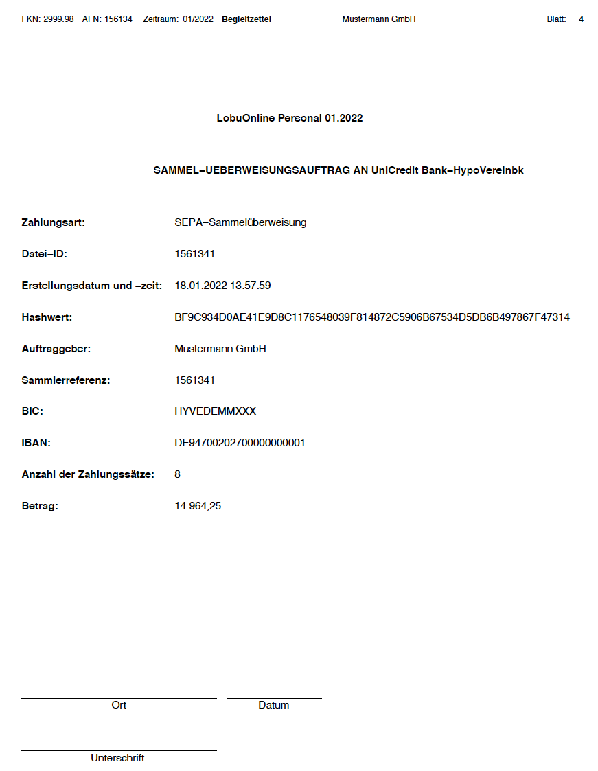 5. In der pdf-Datei finden Sie u.a. den "Begleitzettel" als Sammelüberweisungsauftrag. Diesen leiten Sie zur Freigabe an Ihre Hausbank weiter.