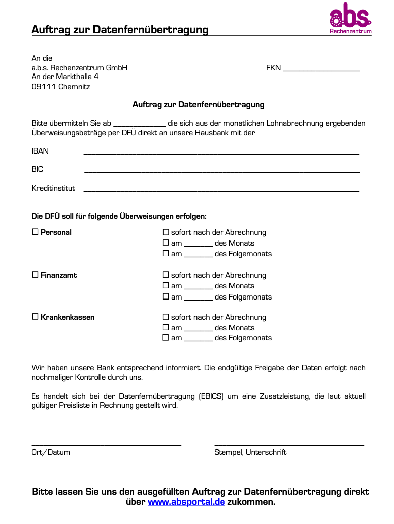 in Ihrem absPortal zur Verfügung. Diese Dateien ermöglichen es Ihnen, die Zahlungsinformationen in Ihr Bankprogramm (Onlinebanking) einzulesen. Dies hat den Vorteil, dass das Fehlerpotenzial gegenüber einer manuellen Eingabe der Überweisungsdaten deutlich gesenkt wird. Datenübertragung mit Begleitzettel (EBICS): Mit der DatenFernÜbertragung (DFÜ) werden die Zahlungsinformationen (separat für die Mitarbeiter, Krankenkassen und für das Finanzamt) direkt an Ihre Hausbank übermittelt. Für die Übertragung der Zahlungsdateien haben Sie mit a.b.s. je einen Termin vereinbart. Ausserdem erhalten Sie mit den Auswertungen einen DFÜ-Begleitzettel, welchen Sie unterzeichnet an Ihre Hausbank übermitteln und somit die Zahlungen freigeben. Hinweis: Für diesen Übertragungsweg sind allerdings separate DFÜ-Vereinbarungen sowohl mit a.b.s. als auch mit der ausführenden Hausbank erforderlich. |