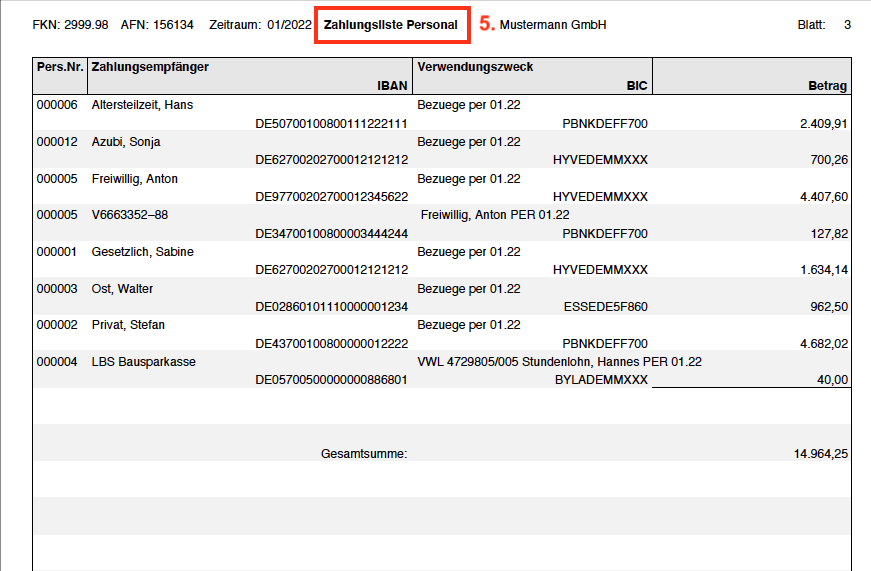 5. In der folgenden Ansicht finden Sie u.a. die Zahlungslisten (für das Personal und ggf. für die Krankenkassen und das Finanzamt). Überweisen Sie die darauf vermerkten Beträge an den jeweiligen Zahlungsempfänger und an die angegebene Bankverbindung.