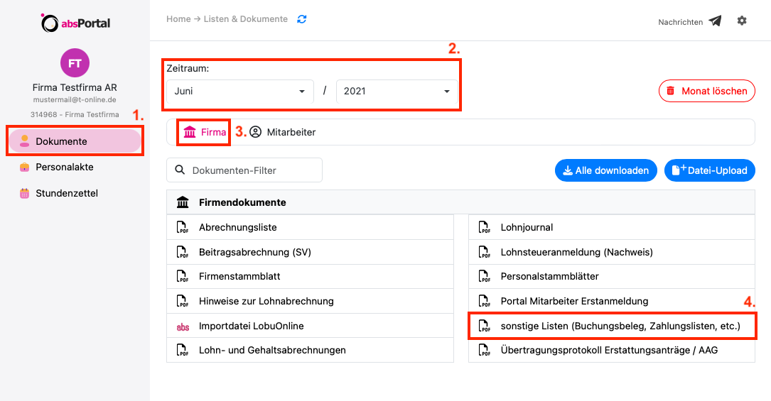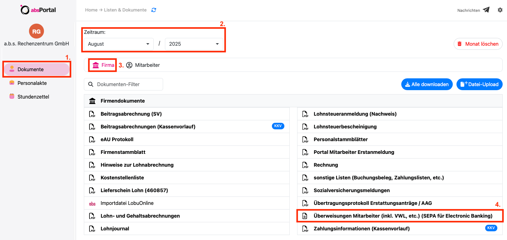 Anhand der Zahlungslisten können Sie die Überweisungen nur manuell selbst erstellen und ausführen. Wir stellen Ihnen dafür das entsprechende pdf-Dokument im absPortal zur Verfügung. Sie finden die Zahlungslisten wie folgt: