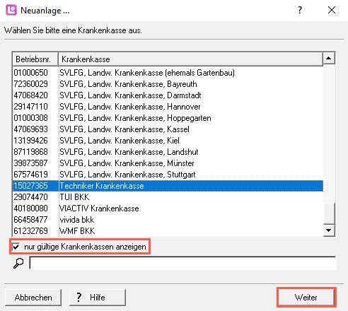 3. Für die Neuanlage werden Ihnen die aktuellen gesetzlichen Krankenkassen angezeigt. Wählen Sie aus der Liste oder über die Suchzeile die Krankenkasse des Mitarbeiters aus (in unserem Beispiel ist das die Techniker KK) und klicken auf "Weiter".