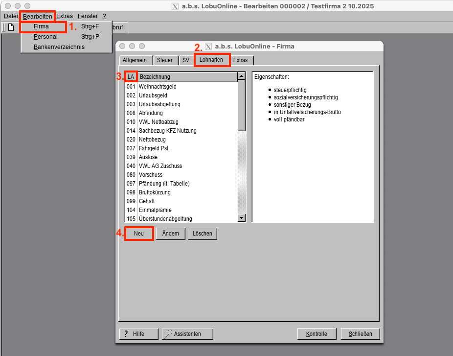 1. Wählen Sie über das Hauptmenü "Bearbeiten" das Untermenü "Firma" und dann das Register "Lohnarten" aus.
