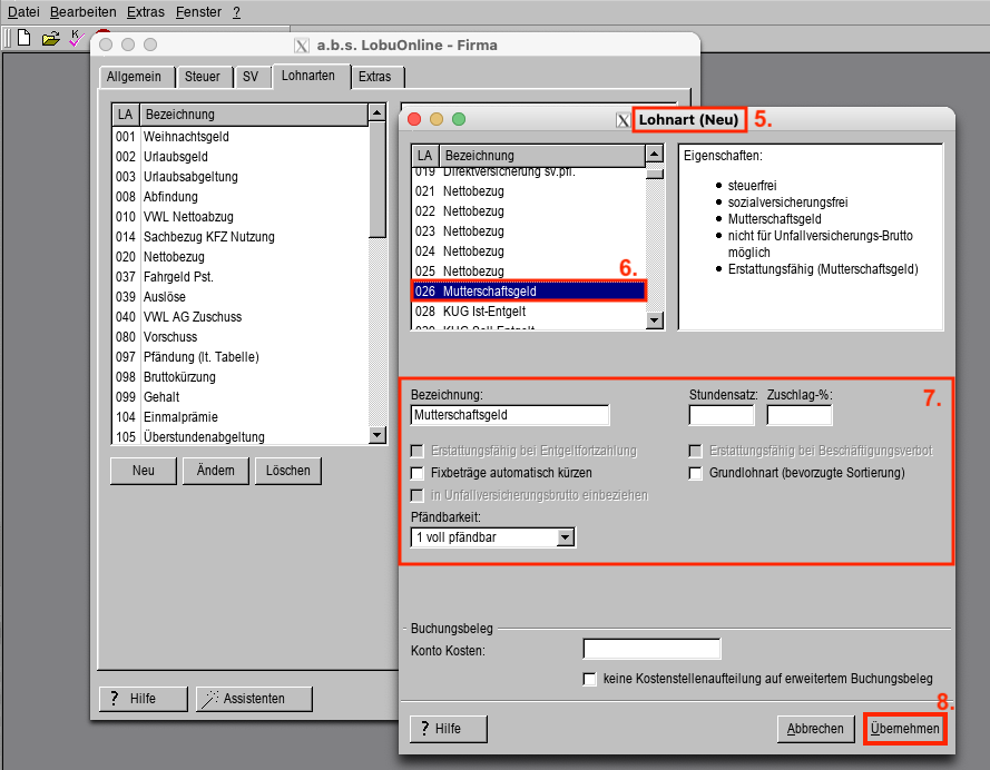 8. Klicken Sie abschließend auf "Übernehmen", so dass die Lohnart zu Ihrem Firmenstamm hinzugefügt wird. Danach können Sie die Lohnart bei den Mitarbeitern hinterlegen.