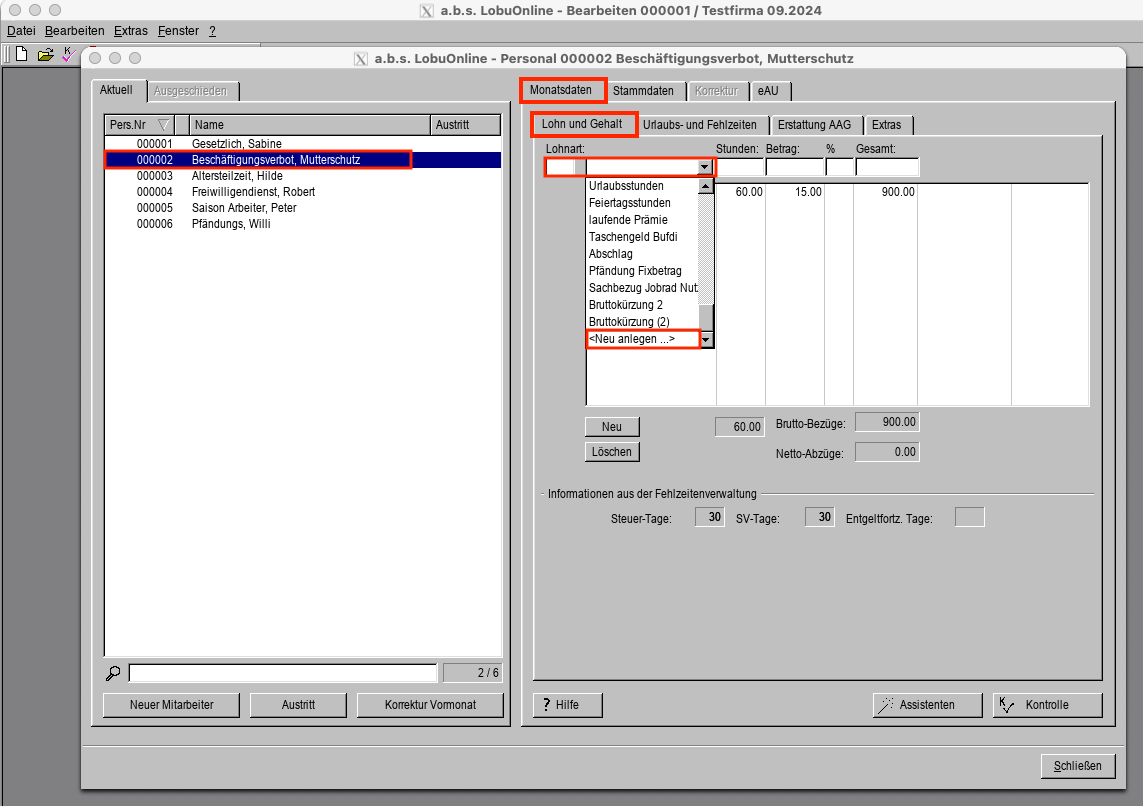 6. Suchen Sie die bzw. eine Lohnart für den abzubildenden Sachverhalt (z.B. für Einmalzahlungen, Nettobezug, Bruttobezug, Nettoabzug, Bruttokürzung, etc.) und markieren diese mit einem Mausklick. In unserem Beispiel wird die Lohnart LA 026 Mutterschaftsgeld für die Abrechnung von Mutterschutz benötigt.