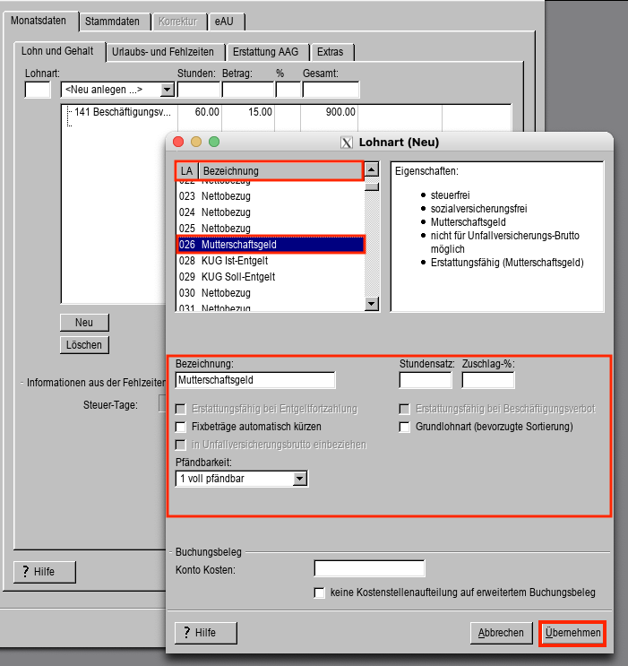 4. Sortieren Sie die Lohnarten über die Spalte "LA" oder "Bezeichnung", wählen die benötigte Lohnart (in unserem Bsp. LA 026 Mutterschaftsgeld), passen ggf. noch die Bezeichnung und die Eigenschaften an und klicken abschließend auf "Übernehmen".