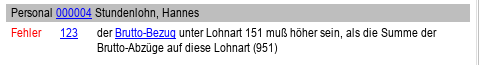 Hinweis: Erhalten Sie bei einem Mitarbeiter den "Fehler 123" mit diesem oder ähnlichem Fehlertext: "Der Brutto-Bezug unter Lohnart 151 muß höher sein, als die Summe der Brutto-Abzüge auf diese Lohnart (951)", müssten Sie eine weitere Bruttokürzungslohnart (z.B. LA 940) im Firmenstamm hinzufügen, abhängig davon, von welchem Entgelt die Kürzung erfolgen kann.