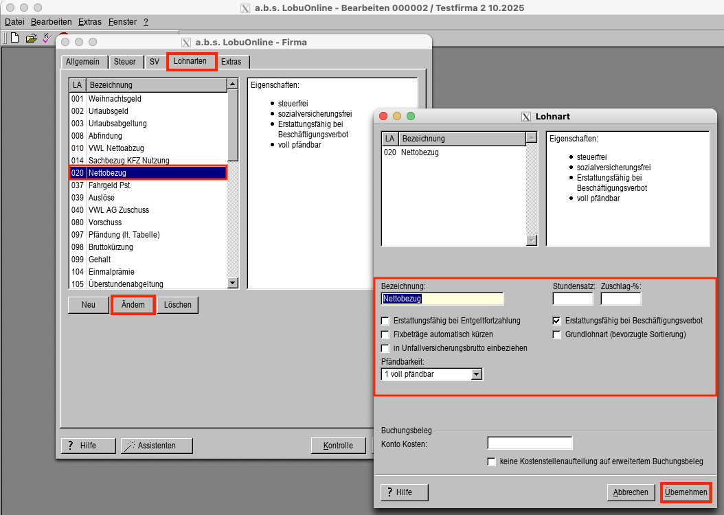 3. Nun können Sie die Eigenschaften der Lohnart anpassen und/oder ggf. die Bezeichnung ändern. Schließen Sie den Vorgang mit "Übernehmen" ab.