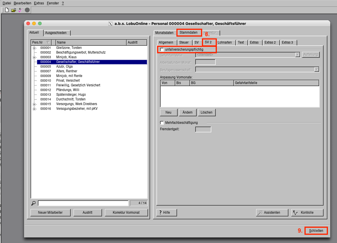 8. Wechseln Sie danach in das Unterregister "SV2" und deaktivieren die Option "unfallversicherungspflichtig".