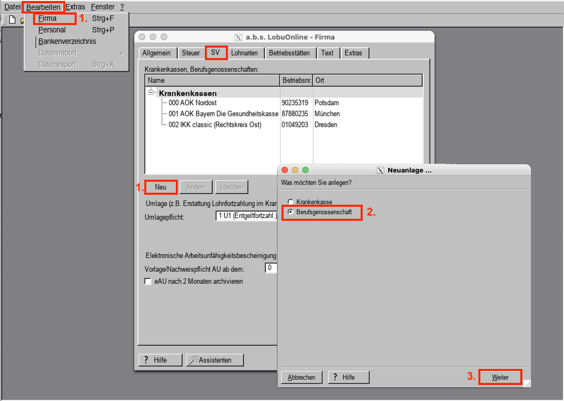 1. Navigieren Sie vom Hauptmenü "Bearbeiten" über das Untermenü "Firma" zum Register "SV (Sozialversicherung)" und klicken hier auf "Neu".