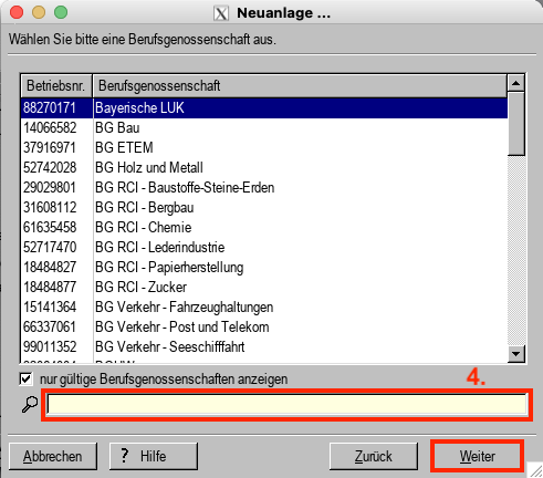 4. Wählen Sie aus der Auflistung die für Sie zuständige BG aus. Sie können auch nach einer BG bzw. BG-Betriebsnummer suchen. Klicken Sie auf "Weiter" und vervollständigen die Stammdaten, wie nachfolgend beschrieben.
