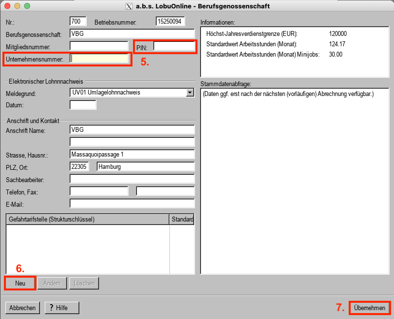Die für die Lohnabrechnung zwingend erforderlichen Stammdaten beinhalten die Unternehmensnummer, die PIN und die Gefahrtarifstelle(n). Sie erhalten diese Daten von Ihrer Berufsgenossenschaft i.d.R. schriftlich mitgeteilt.