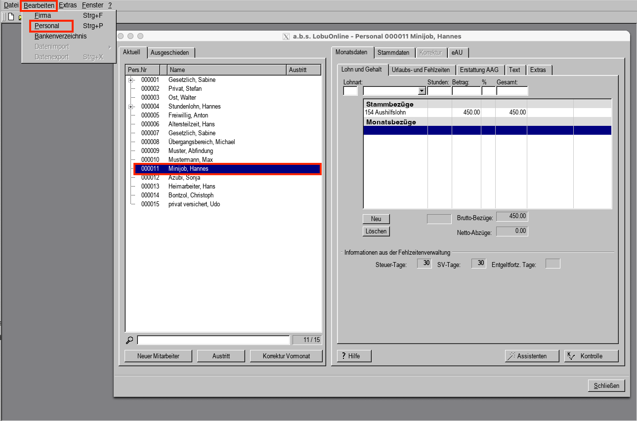 1. Wählen Sie im Menü "Bearbeiten -> Personal" den entsprechenden Mitarbeiter aus.