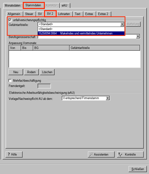 3. Bei sv-pflichtigen Mitarbeitern sollte das Häkchen bei "unfallversicherungspflichtig" gesetzt sein.