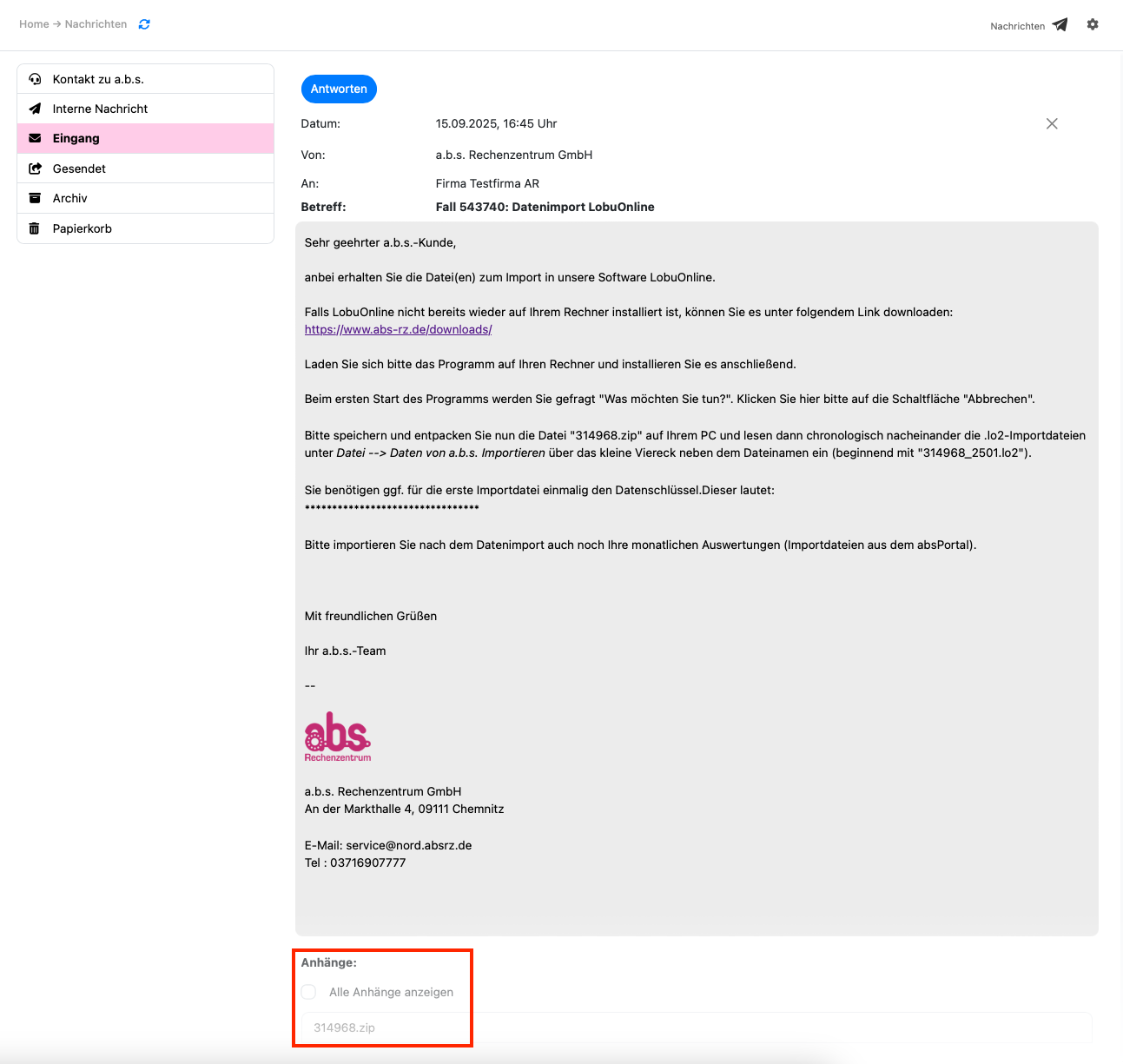 4. Wählen Sie in Ihrem Posteingang die Nachricht mit dem Betreff "Datenimport", in der das weitere Vorgehen beschrieben wird. Klicken Sie im Anhang (ganz unten nach dem Text) auf die ".zip-Datei" (oder evtl. auch auf eine .lo2-Datei, je nach Datenlieferung).