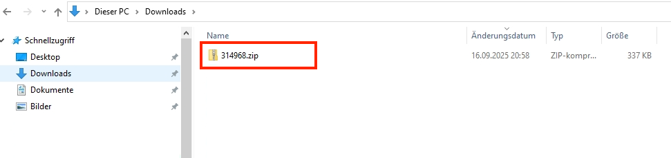 6. Wechseln Sie zum Windows-Explorer (bei einem WINDOWS PC), suchen die ".zip-Datei" auf Ihrem Rechner (hier im Download-Ordner) und klicken dann mit der rechten Maustaste auf die ".zip-Datei". Es öffnet sich das Kontextmenü.