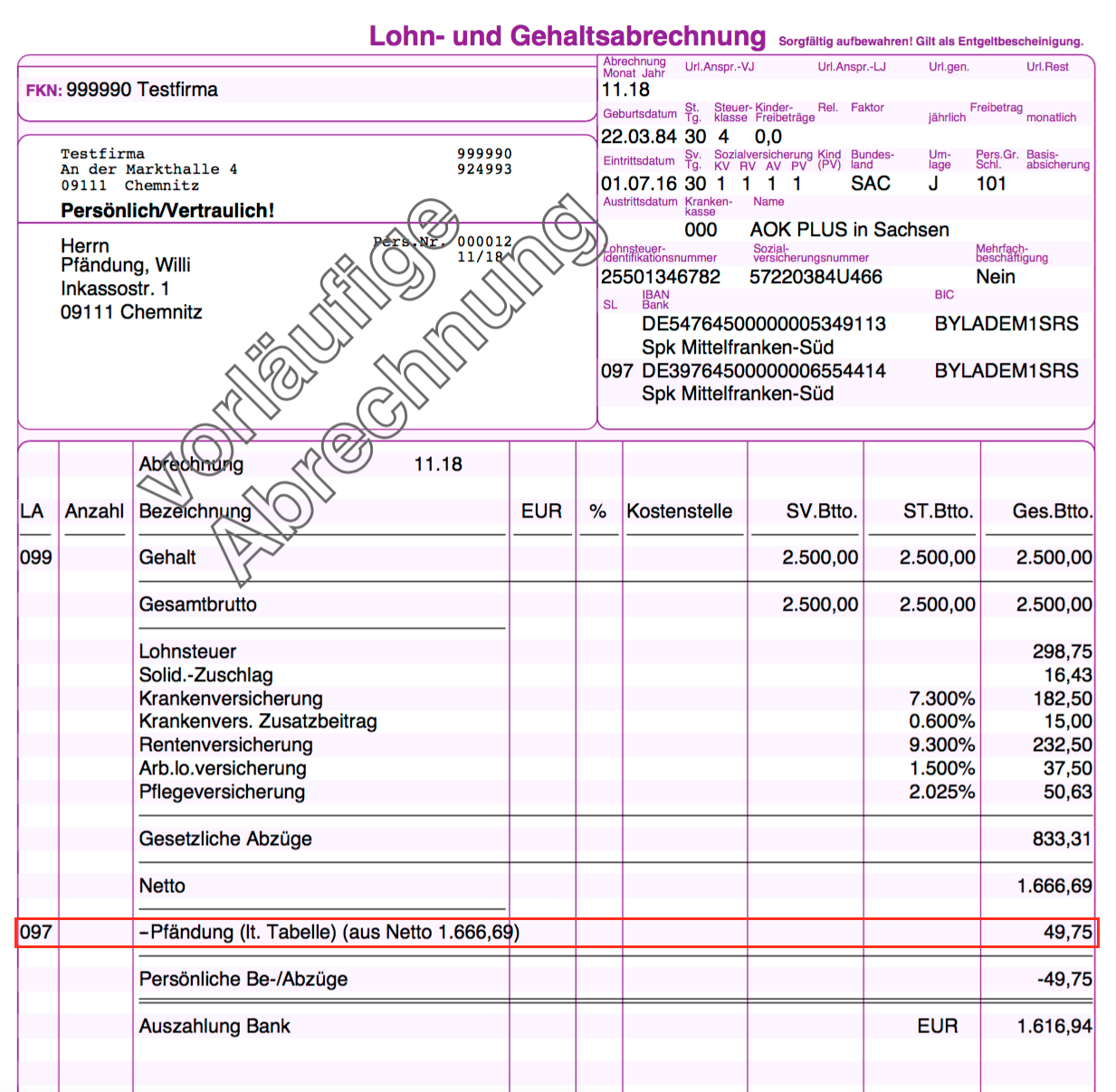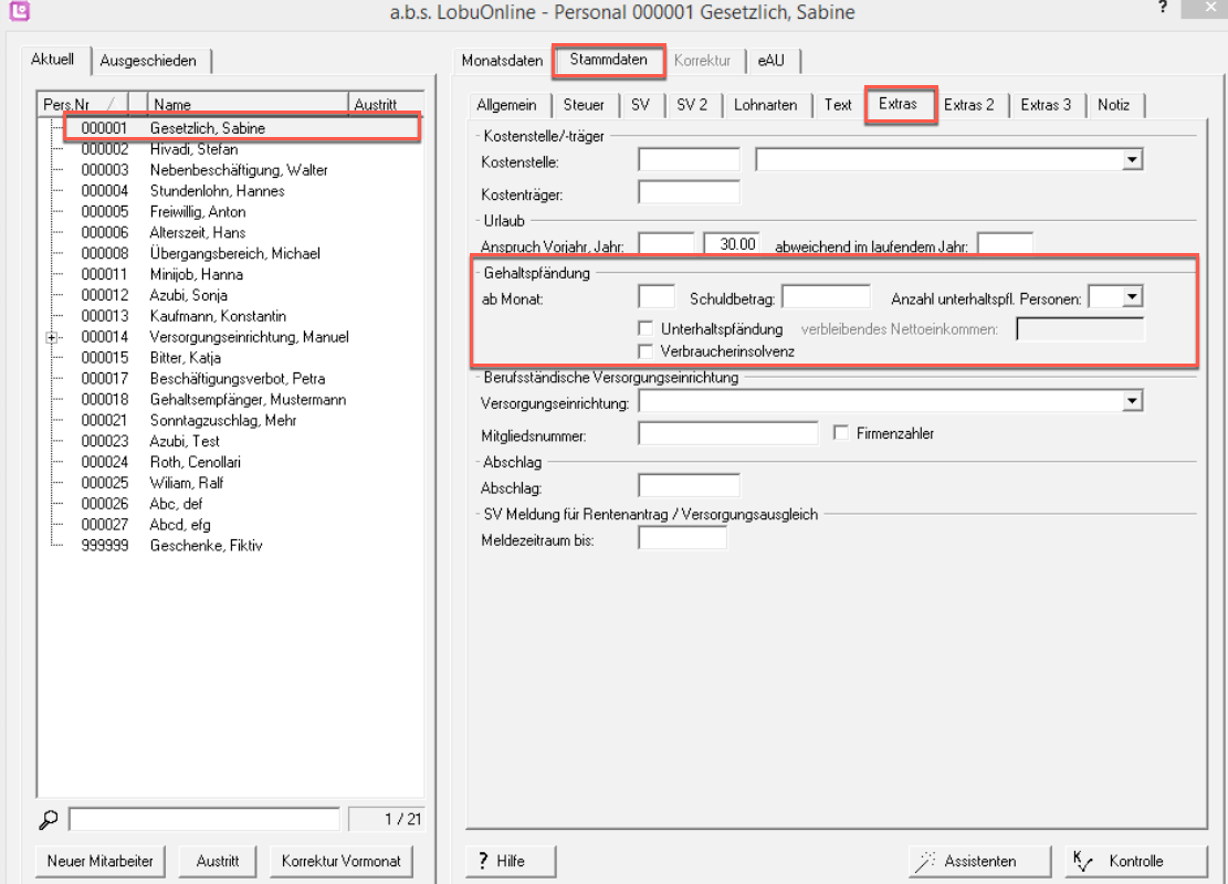 b) die Angaben für die Pfändung in den Stammdaten des Mitarbeiters müssen vollständig sein