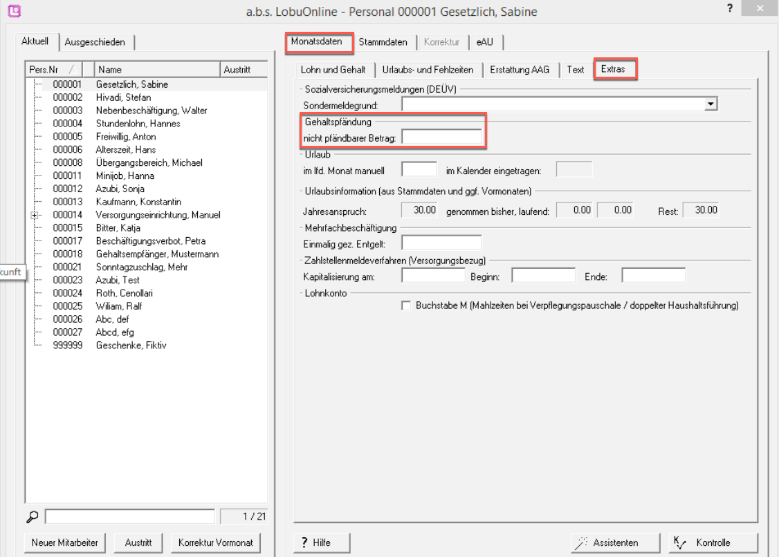 4. Erfassen Sie die nicht pfändbaren Beträge – sofern vorhanden – unter den ”Monatsdaten” im Register ”Extras”. Ein Eintrag ist jedoch nur dann erforderlich, wenn die Eigenschaft nicht pfändbar nicht bereits direkt bei der entsprechenden Lohnart hinterlegt wurde (z. B. bei der Abrechnung von Weihnachtsgeld).