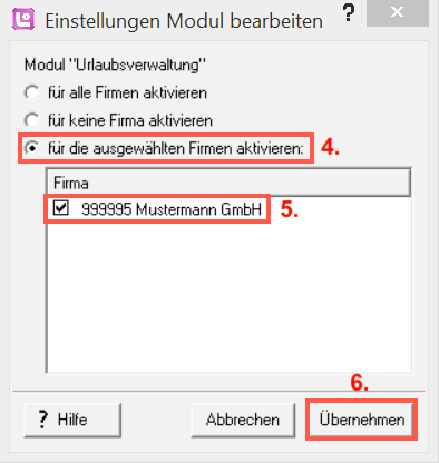 4. Wählen Sie im Folgefenster “Einstellungen Modul bearbeiten” den Punkt "für die ausgewählte Firma aktivieren".