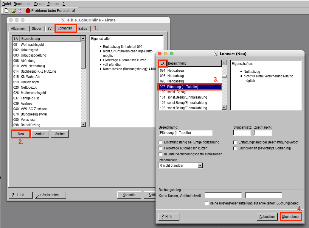Einrichten der Lohnart LA 097 "Pfändung (lt. Tabelle)" im Firmenstamm und Verwendung bei den Mitarbeitern