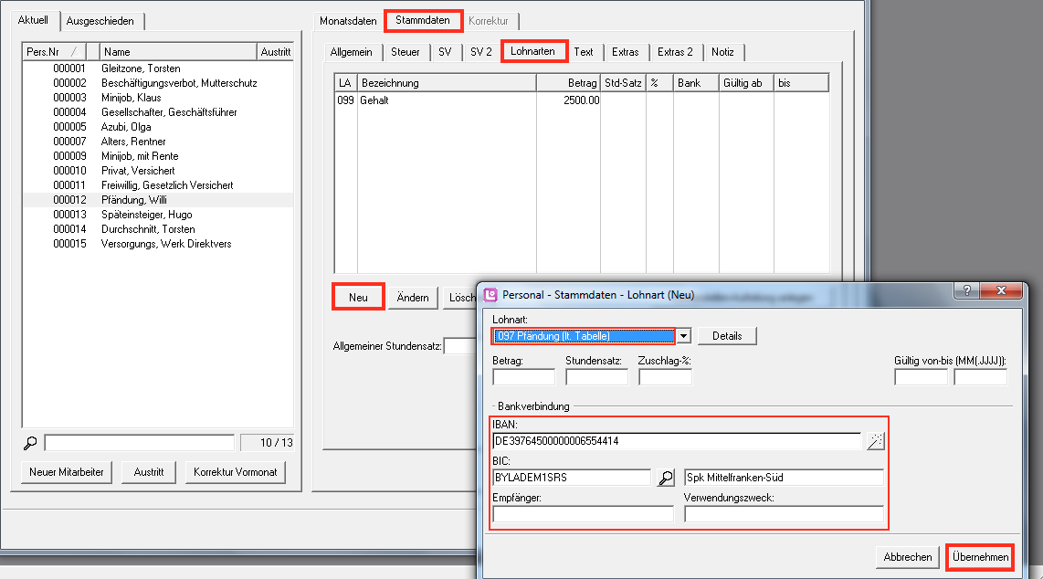 2. Wechseln Sie danach in das Register "Lohnarten" und ordnen dem Mitarbeiter über die Schaltfläche "Neu" die Lohnart LA 097 zu. Hier besteht die Möglichkeit, die Überweisungsdaten wie IBAN, BIC, den Pfändungsempfänger und den Verwendungszweck (meistens das Aktenzeichen auf dem Pfändungsbescheid) zu erfassen. Bestätigen Sie die Zuordnung mit "Übernehmen".
