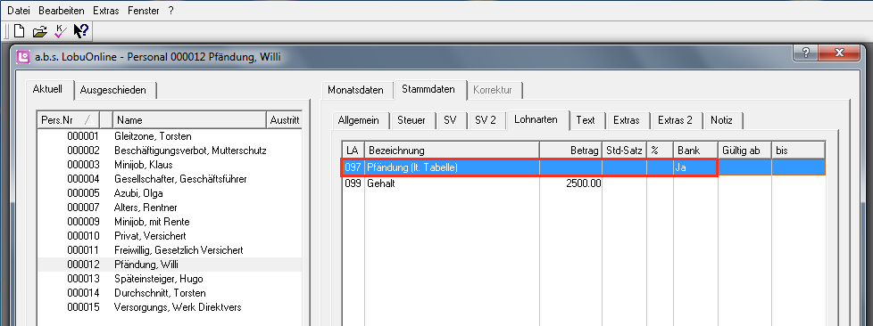 d) die Lohnart LA 097 "Pfändung (lt. Tabelle)" muss im Firmenstamm vorhanden sein und bei den entsprechenden Mitarbeitern in den Stammdaten hinterlegt sein
