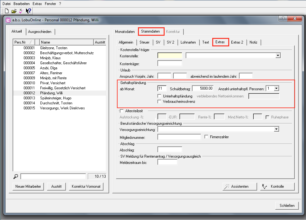1. Erfassen Sie die Pfändungsdaten unter "Bearbeiten/Personal" in den "Stammdaten" unter "Extras", wie nachfolgend an dem Beispiel skizziert.