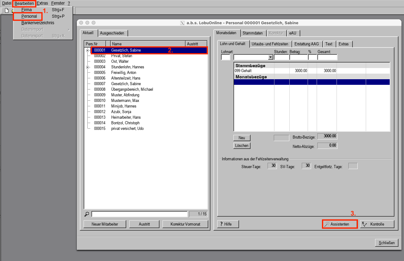 1. Wählen Sie im Hauptmenü unter "Bearbeiten" das Untermenü "Personal" aus.