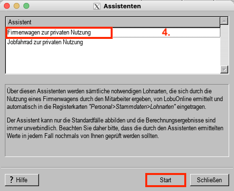 4. Markieren Sie den Firmenwagen-Assistent und klicken auf "Start".