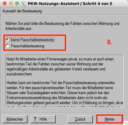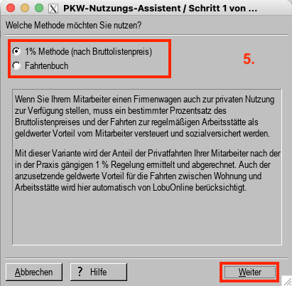 5. Wählen Sie im 1. Schritt zwischen der "1 % Methode" und dem "Fahrtenbuch" und klicken auf "Weiter". (Beschreibung Fahrtenbuch-Methode)