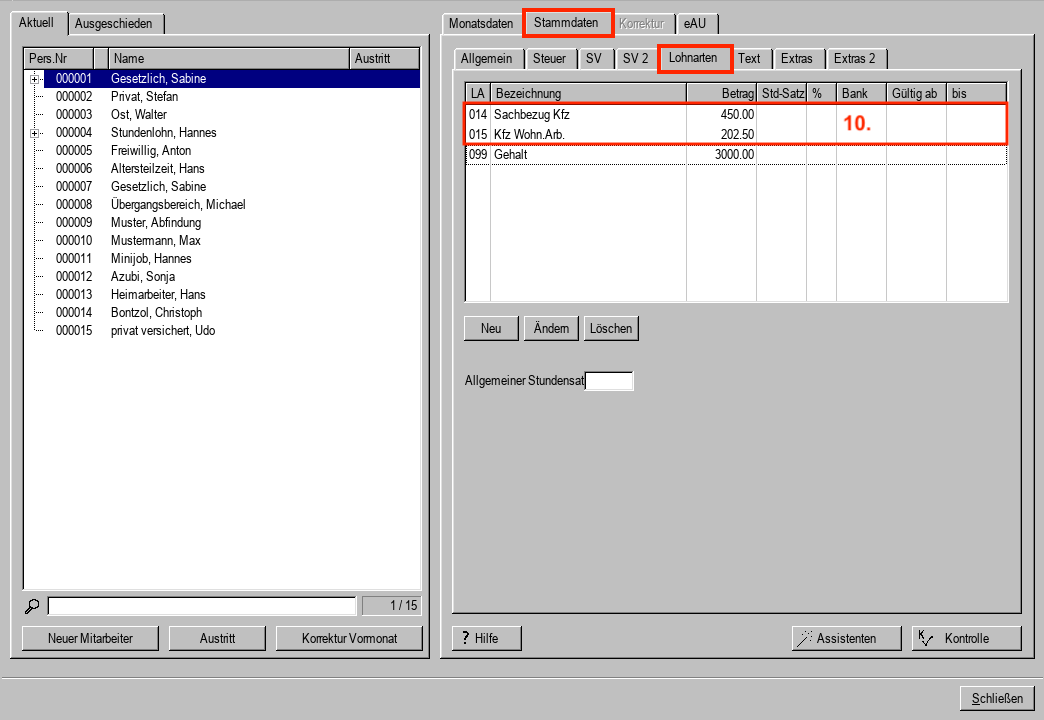 - Lohnart LA 014 Sachbezug KFZ Nutzung für die monatliche Abrechnung.