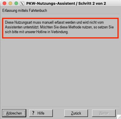 Wenn Sie im 1. Schritt des Assistenten die Fahrtenbuch-Methode wählen, wird Ihnen ein Hinweis für die manuelle Erfassung der entsprechenden Beträge angezeigt. Bitte verwenden Sie in diesem Fall entweder die