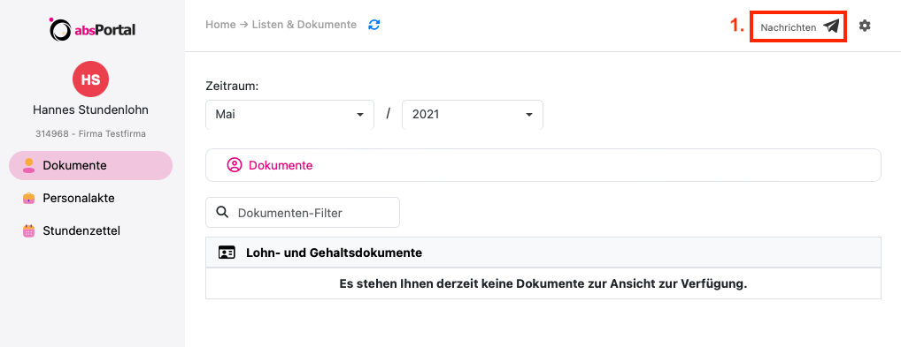 1. Klicken Sie auf der Seite oben rechts auf das Symbol "Nachrichten“. Diese Funktion kann von jeder absPortal-Seite aufgerufen werden.