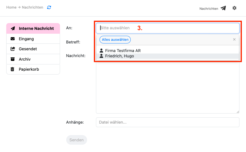 3. Wählen Sie den oder die Empfänger der Nachricht im Feld "An:" aus. Hier haben Sie die Möglichkeit, eine Nachricht an Ihren Arbeitgeber und/oder Lohnsachbearbeiter zu versenden.