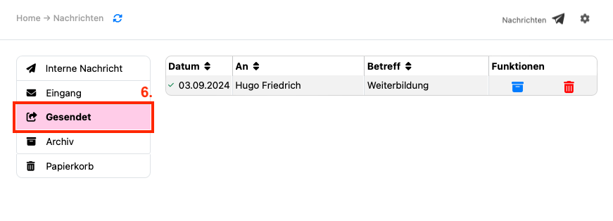 6. Unter "Gesendet" können Sie alle versendeten Nachrichten einsehen und bzgl. Empfänger und versandte Anlagen überprüfen.