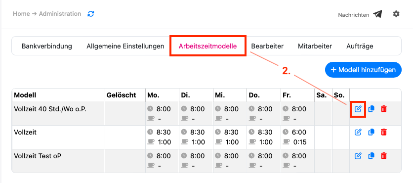 2. Wählen Sie anschließend das Menü "Arbeitszeitmodelle" und klicken auf das Symbol "Bearbeiten" beim entsprechenden Arbeitszeitmodell.