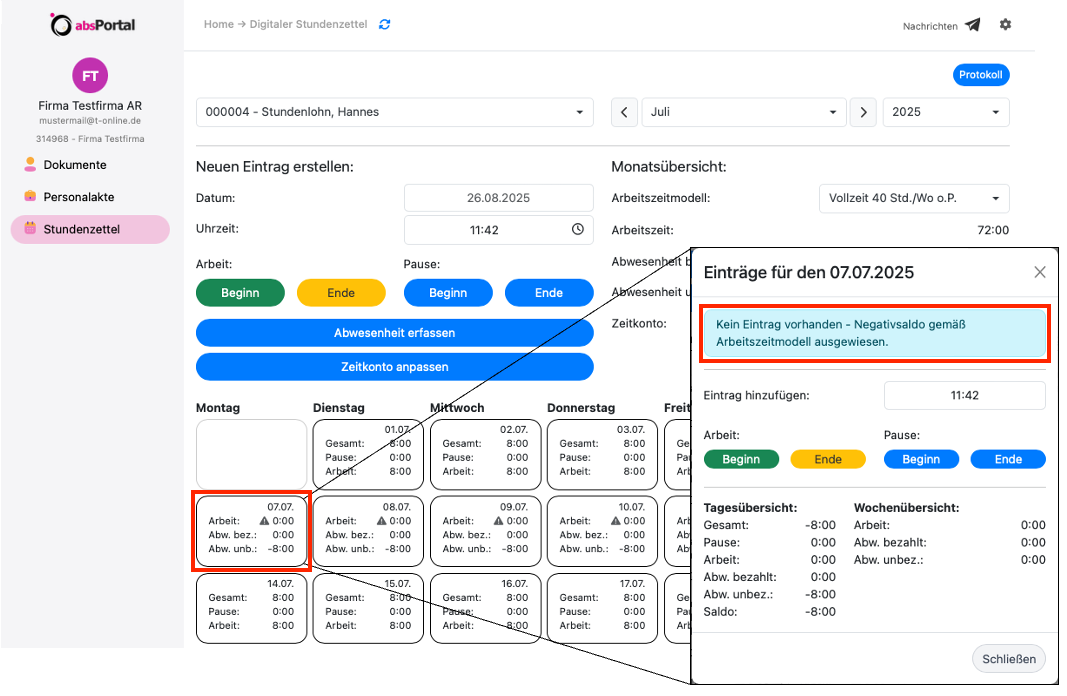 Arbeitszeitsaldo pro Tag: Der Arbeitszeitsaldo wird täglich auf Basis des hinterlegten Arbeitszeitmodells berechnet, um eine genaue Übersicht über die Arbeitsleistung zu ermöglichen.