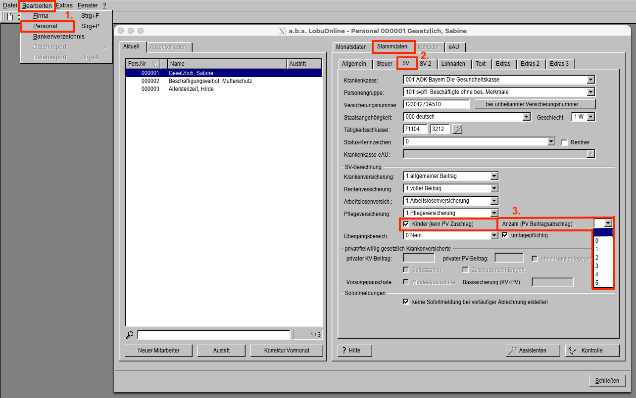 3. Im Abschnitt "SV-Berechnung" finden Sie die beiden Felder für die Beurteilung des Pflegeversicherungsbeitrages. Setzen Sie das Häkchen bei "Kinder (kein PV-Zuschlag)" und wählen die Anzahl der Kinder des Mitarbeiters bei "Anzahl (PV-Beitragsabschlag)" aus.