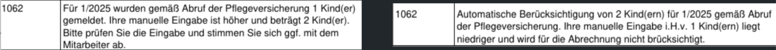 Auf den Lohnabrechnungen ist im Feld "Kind (PV)" der Wert zu sehen, mit dem tatsächlich abgerechnet wurde. Auf dem Personalstammblatt wird weiterhin der in LobuOnline hinterlegte Wert angedruckt. Die im DaBPV Verfahren gemeldete Kinderanzahl ist bei Abweichungen dem Hinweis “Code 1062” auf dem Hinweisprotokoll zu entnehmen: