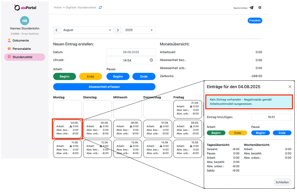 Wenn einem Mitarbeiter ein Arbeitszeitmodell zugeordnet wurde, erscheint aktuell automatisch ein Hinweis mit dem "!" im Stundenzettel, wenn an einem Arbeitstag kein Zeiteintrag vorliegt. Tragen Sie für diese Tage dann zeitnah entweder die Arbeits- oder Abwesenheitszeiten nach.