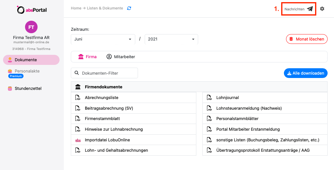 1. Klicken Sie oben rechts auf das Symbol "Nachrichten“. Diese Funktion kann von jeder absPortal-Seite aufgerufen werden.