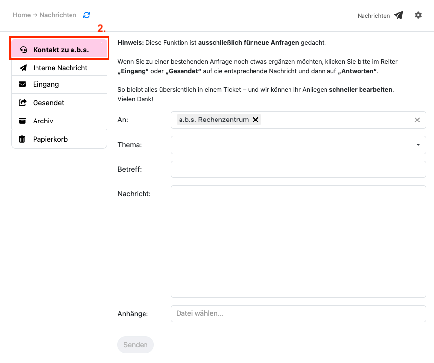 Hinweis: Die Schaltfläche "Senden" ist erst aktiv, wenn die Felder "Thema" und "Betreff" ausgefüllt sind.