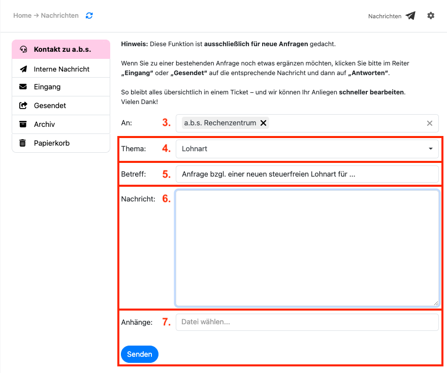 Der Versand von Nachrichten zu uns ins Rechenzentrum im absPortal ist auch mit der kostenlosen Variante des absPortals möglich.