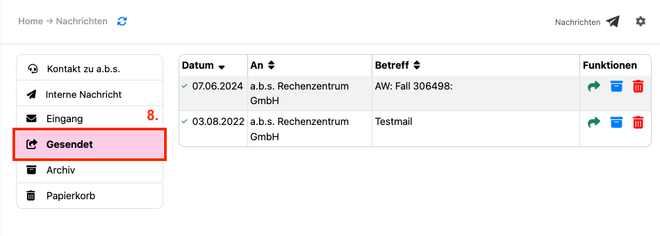 8. Unter "Gesendet" können Sie alle versendeten Nachrichten einsehen und ggf. darauf antworten, archivieren oder löschen.