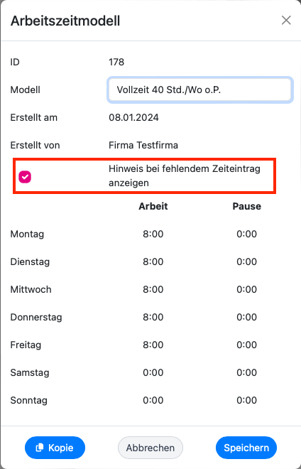 Sie können diesen Hinweis auch ausblenden, indem Sie das entsprechende Arbeitszeitmodell ändern und das Häkchen entfernen.