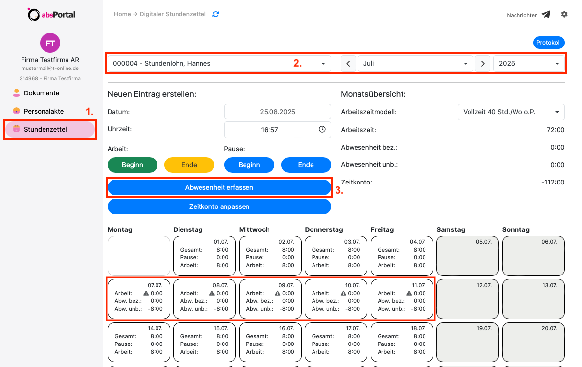 Beispiel: Der Mitarbeiter Hr. Hannes Stundenlohn hat vergessen, seinen Urlaub vom 07.07.25 - 11.07.25 einzutragen. Da der Monat 07.25 für Zeiteingaben bereits abgeschlossen wurde, kann der Mitarbeiter selber seine Urlaubszeit nicht mehr eintragen. In diesem Fall muss der Lohnsachbearbeiter der Firma die Abwesenheitszeit nachtragen.