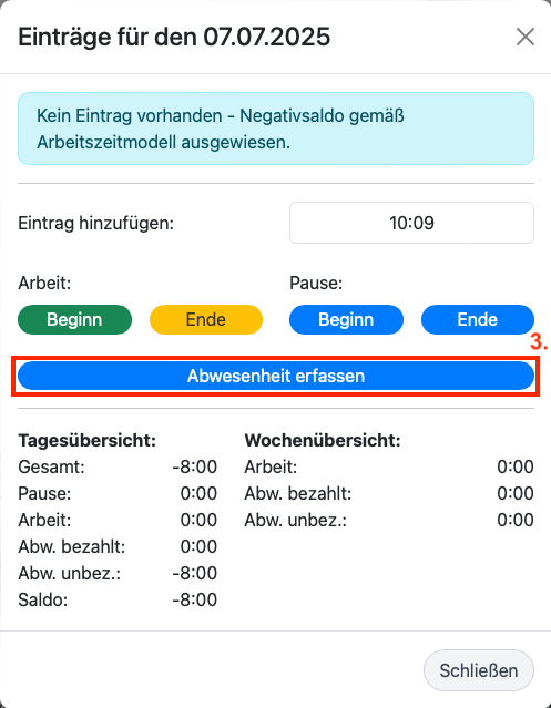 6. Klicken Sie zum Beenden der Eingabe auf "Erfassen", so dass die Abwesenheitszeit gespeichert wird.