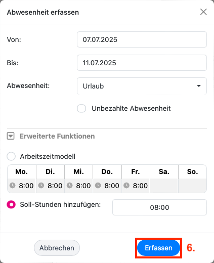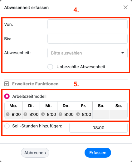 5. Unter den erweiterten Funktionen wählen Sie entweder ein hinterlegtes Arbeitszeitmodell oder ggf. die Stundenanzahl, die Sie normalerweise arbeiten würden, aus.