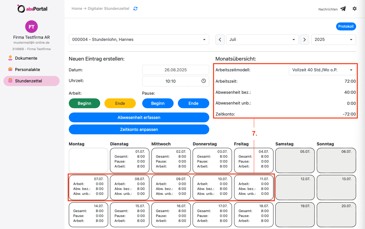 Im Beispiel wurde für die Zeit vom 07.07.25 bis 11.07.25 eine bezahlte Abwesenheit/Fehlzeit "Urlaub" erfasst. Weiterhin wurden statt dem Arbeitszeitmodell die Soll-Stunden (8 Std. pro Tag) für die Urlaubszeit gewählt.