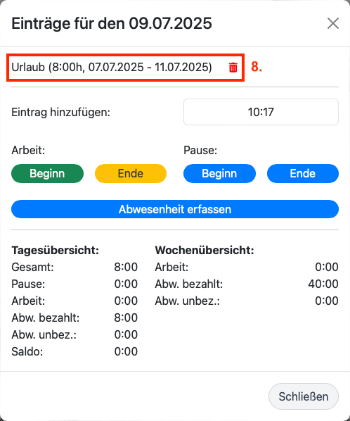 8. Mit einem Klick auf einen beliebigen Wochentag dieser Woche sehen Sie die erfassten Einträge und können diese hier auch über das "Mülltonnen-Symbol" wieder löschen. Da in diesem Beispiel ein Zeitraum (07.07.-11.07.) erfasst wurde, würden Sie in jeder Tagesansicht auch immer den komplett erfassten Zeitraum löschen und keine einzelnen Tage.